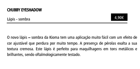 A marca dospõe de sombras de alto pimento, sombras para utilização simultânea em seco e em húmido e sombras em lápis. Todas as gamas dispõem de variadas e fabulosas cores.